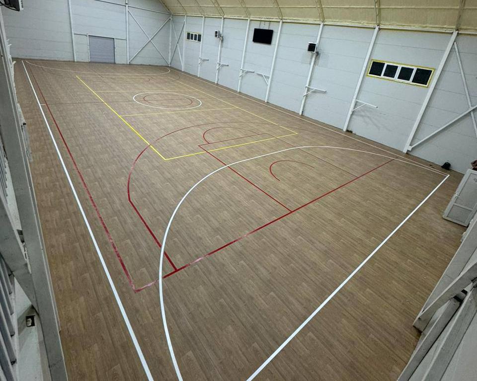 Затем, после высыхания наливного пола, мы постелили спортивный линолеум толщиной 6мм путем 100% приклеивания к основанию с запайкой швов и нанесли 3 разметки (баскетбол, волейбол, мини-футбол)
